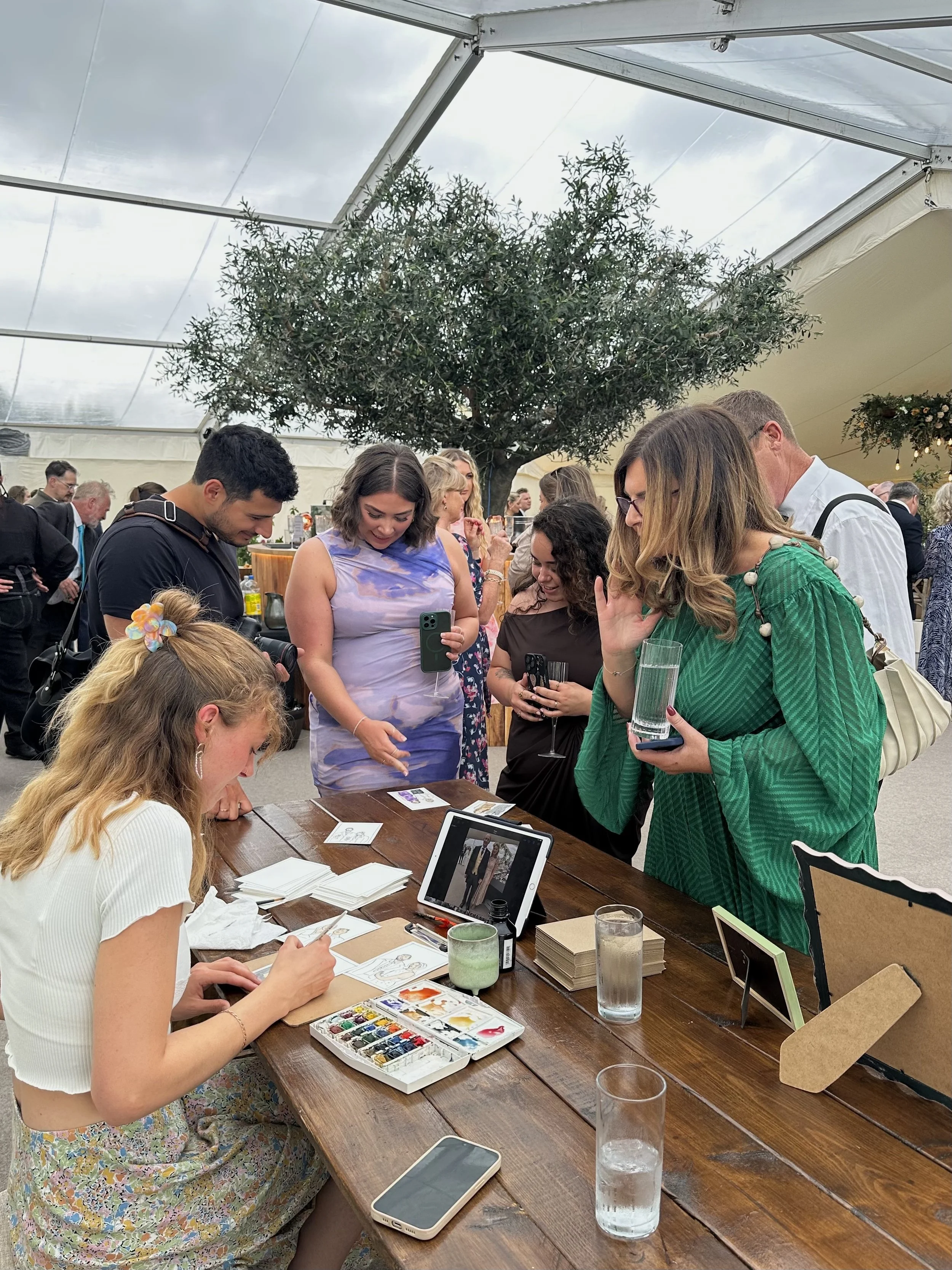 I’m a live illustrator, based in the South West and Central London, bringing events to life one portrait at a time. Using ink and watercolour in my signature quirky, expressive style. I create spontaneous portraits that capture more than just a likeness, they reflect each guests’ personality and spark.